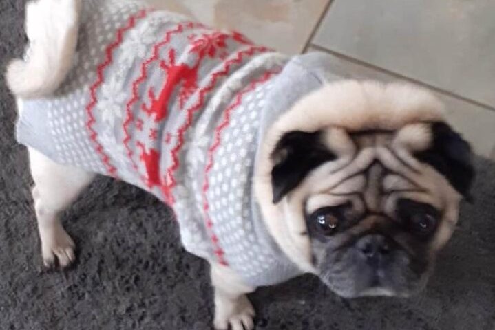 Billy showing off his new clean Christmas jumper. A few hours before the photo was taken he had been for a walk and rolled in something unmentionable. That’s dogs for you!!