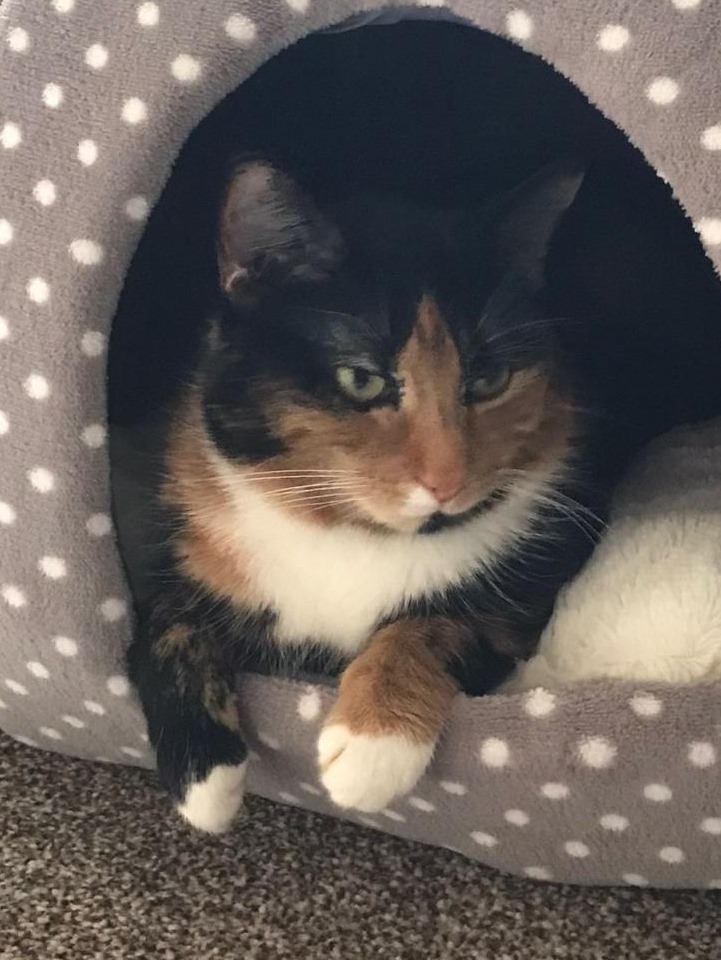 She’s always happy and purring and she’s been into the garden with her harness on as we teach her new things every day and she’s very bright and clever .