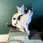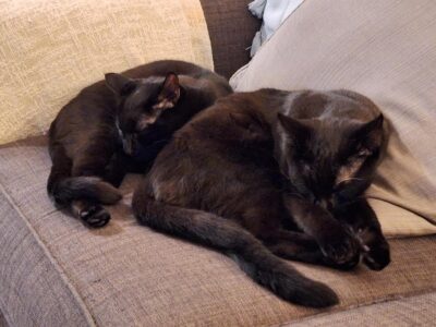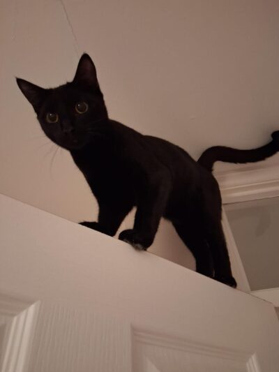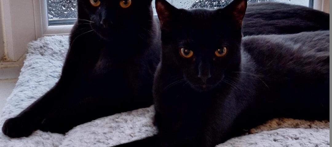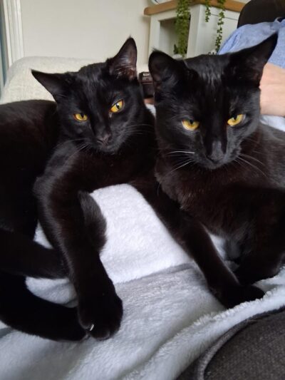 An update on Pickle and Cosmo (were Gavin and Smithy). Both have settled in really well. Although they’re identical they very much have their own personalities. They’re enjoying doing all the things kittens love, – playing, sleeping and they particularly love their food and getting up to mischief (see pictures of them on top of doors and in the Christmas tree!). Overall lovely cats and both have now decided they quite like a lap to sleep on.